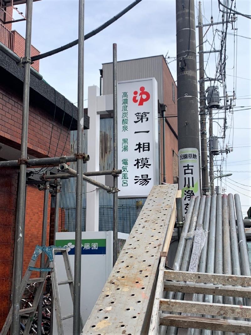 既存の支柱を塗装し、袖看板を設置致しました。 【既存袖看板交換、支柱塗装】 本体:アルミ製 サイズ:W600×H1,800mm 電装:直管LED 表示面:インクジェット出力シート 東京都