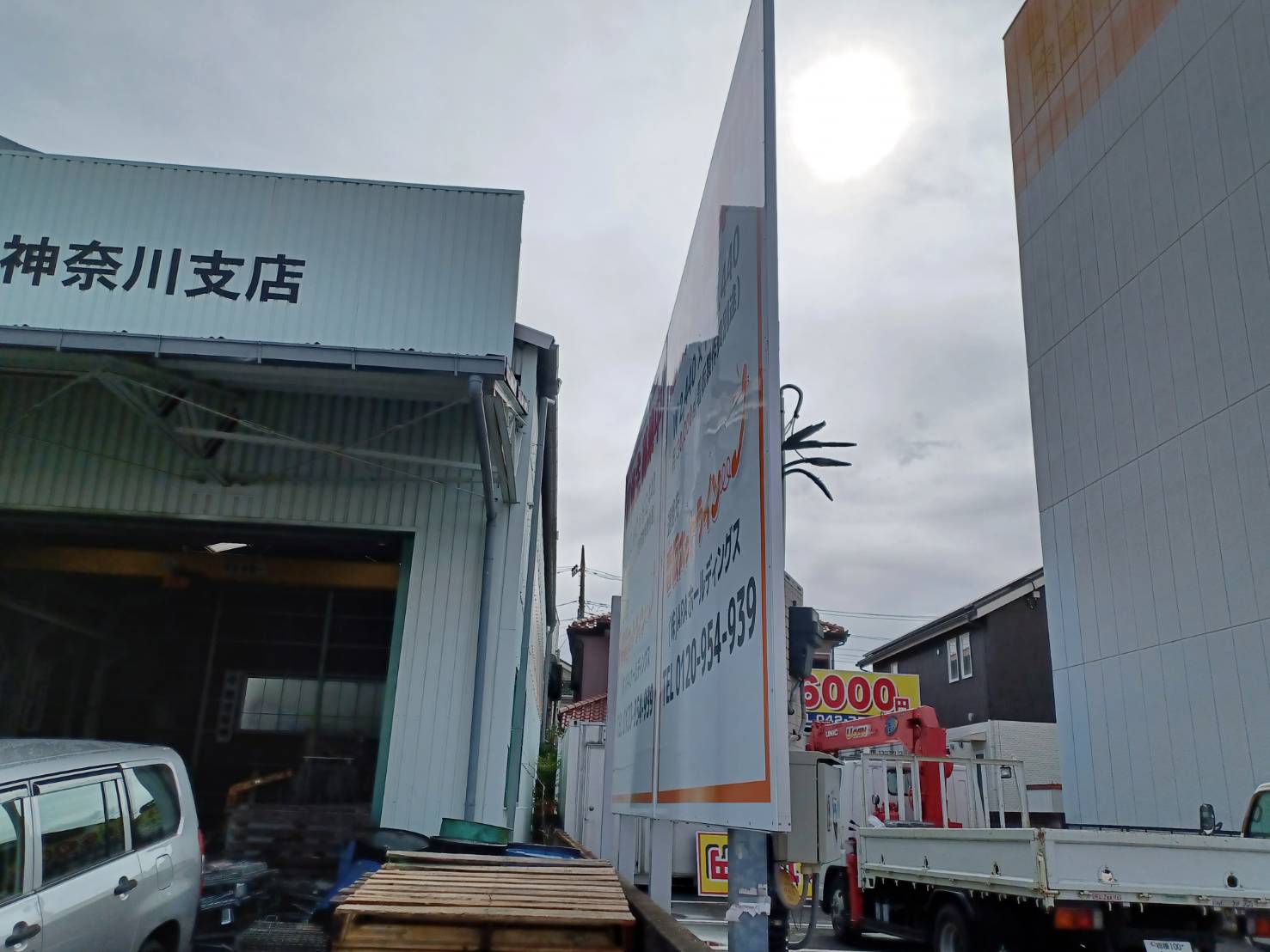 今回の現場では、既存の自立看板を活かしながら、老朽化した部分の改修と、看板全体の安全性・視認性を高める工事を実施しています。
