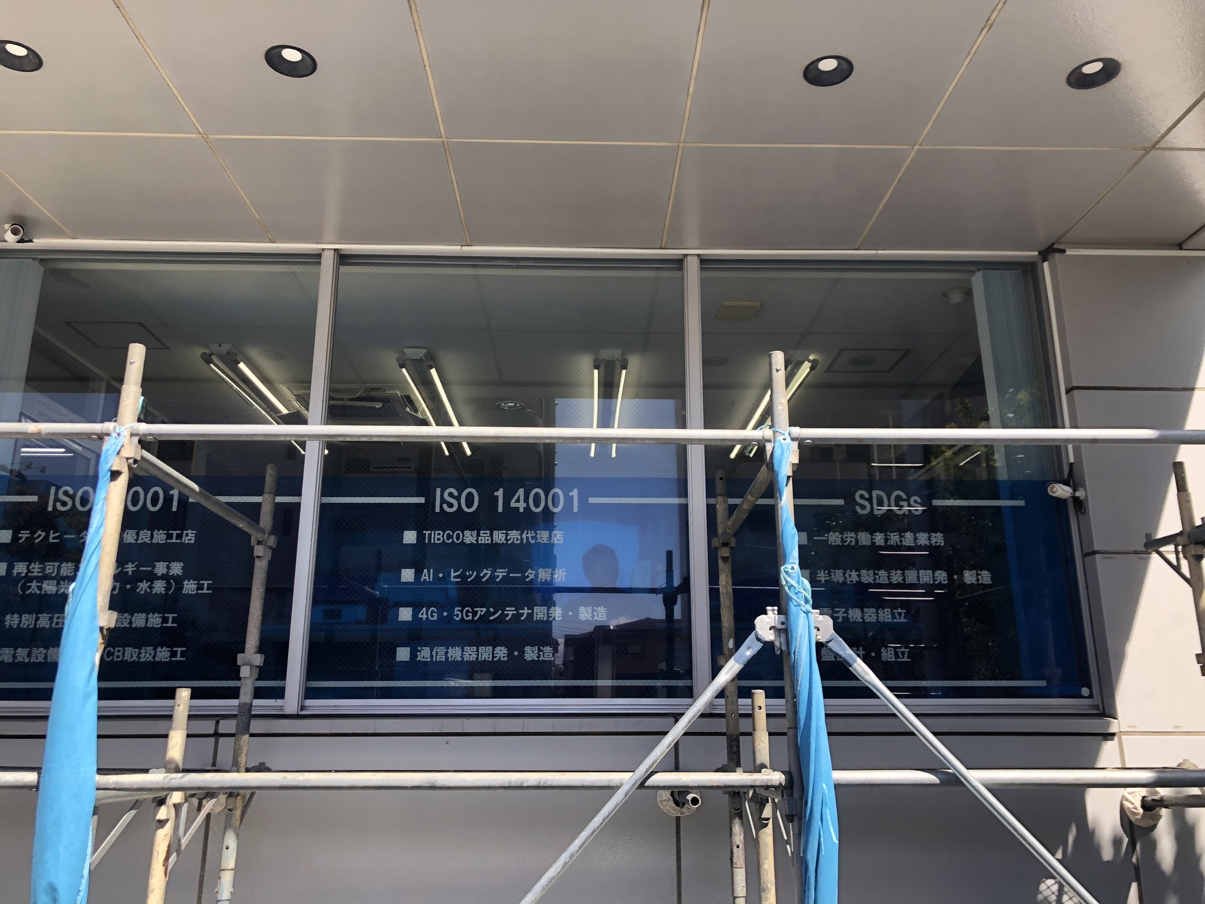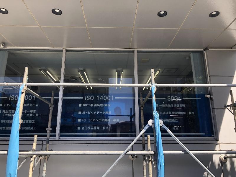 企業情報や事業内容が記載されたガラス面は、外部からの視認性が高く、会社の「顔」となる重要なサインのひとつ。経年劣化や色あせ、デザイン変更に伴い、シート交換をご依頼いただきました。